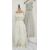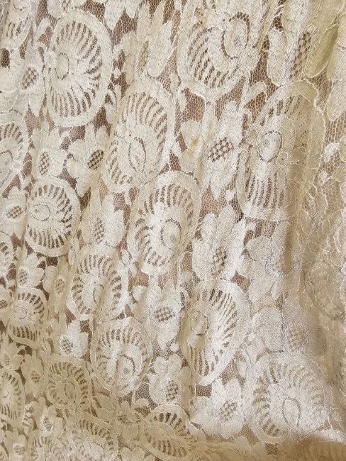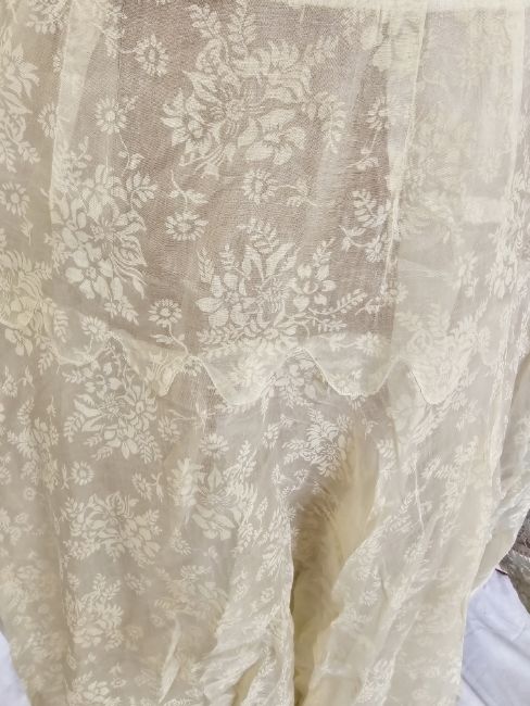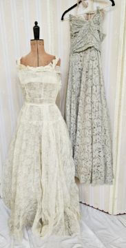 A 1950's grey lace strapless evening dress, ruched bodice, the lace overlaid a pale pink satin and grey  net under dress, side zip fastening and hook and eye, there are some pulled threads, with a stunning cream 1950's full length evening dress, cream printed with white flowers, fitted bodice with scalloped detail to the slightly dropped waist, with frilled shoulder straps and neckline, the skirt is full and sweeping, it has a separate stiff petticoat (3) (both small)