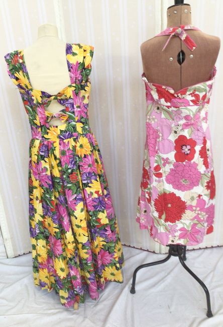 1970's cotton, floral maxi dress, with straps and bows to the back with a vintage Monsoon halter neck cotton mini dress (2)