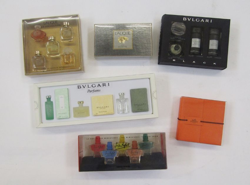 Various perfume bottles to include Hermes , two miniatures in the original box, boxed and sealed 'Lalique pour Homme' , Lalique 'La Collection'  5 miniatures Eau de Parfum, Bulgari 'Parfums' six miniatures boxed,  Bulgari 'Black' boxed, Sonia Rykiel, five boxed miniatures (6)