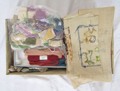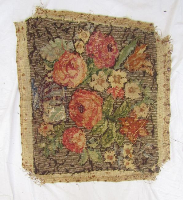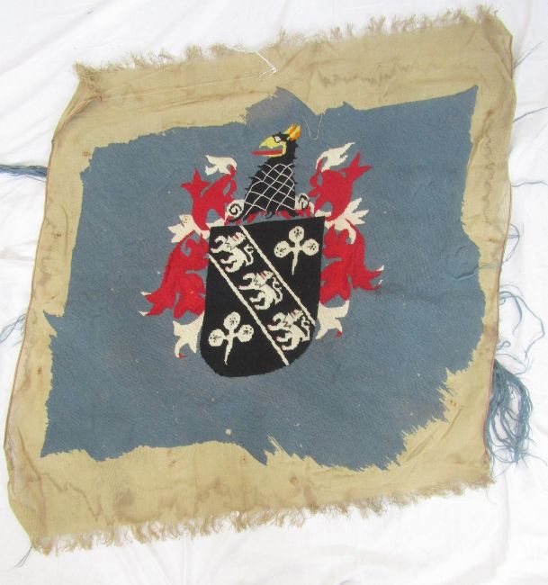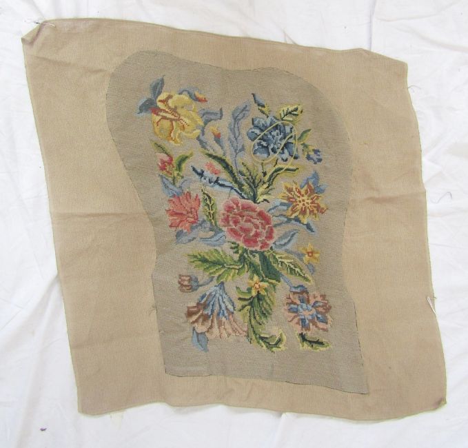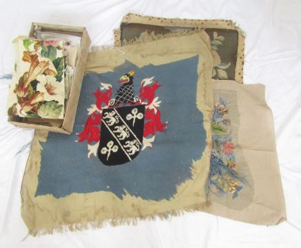Various antique tapestry seat covers, one 54 x 45cms, one depicting roses , 50 x 38cms at widest part, a large tapestry of an armorial crest, a bell-pull, embroidered with roses, embellished with glass beads, 250cms in length, perhaps a border, other unfinished pieces, wool and silks, accessories etc.