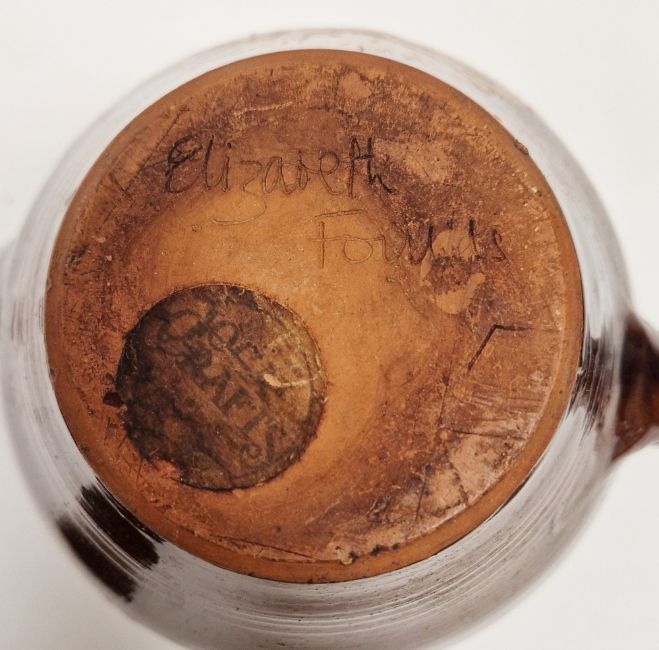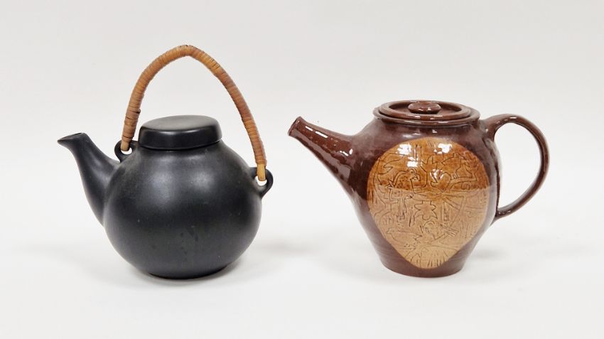 Ulla Procope (1921-1968) for Arabia Finland, a model GA3 teapot with black glaze and cane handle, factory stamp to base, 11.5cm high, together with a studio pottery teapot by Elizabeth Foulds with incised decorated panel of birds on branches on treacle ground, incised signature to base, 12.5cm high (2)