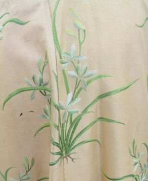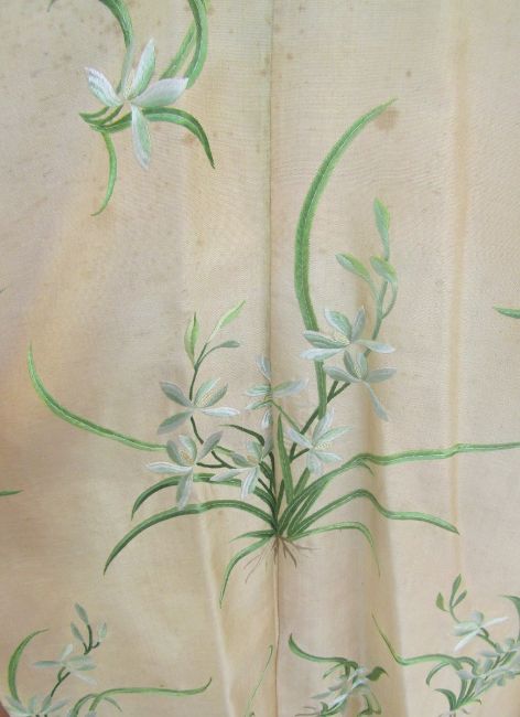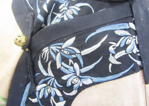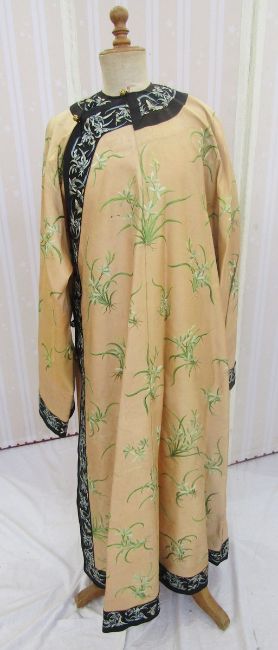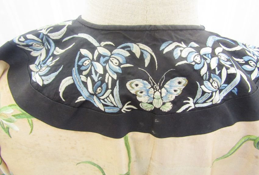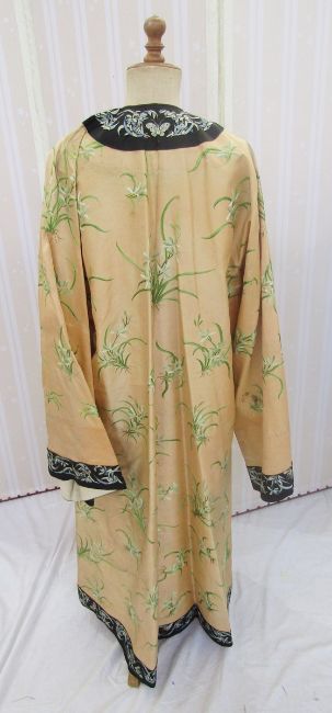 An early 20th century Chinese embroidered robe embroidered with 'noble orchids', the black borders embroidered with butterflies and flowers in shades of blue/green and black, gilt metal open work buttons with black silk frog fastenings, unlined, there are some slight stains