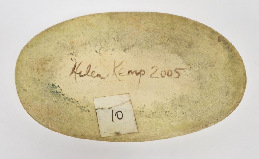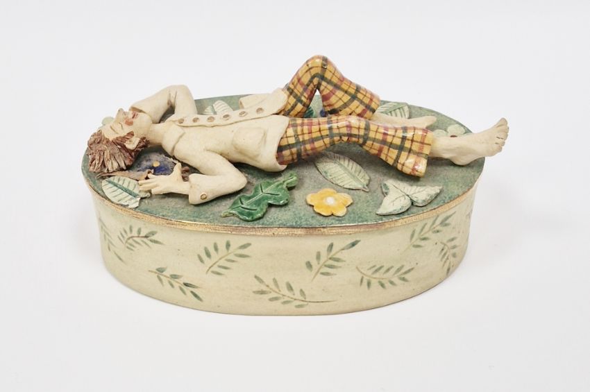 Helen Kemp (contemporary) a hand-modelled earthenware lidded oval dish, the lid with male figure lying amongst flowers and leaves, signed and dated 2005 to base, 8cm high, 16cm long