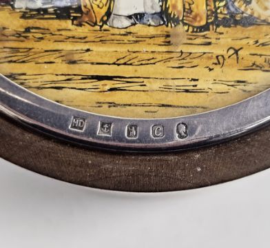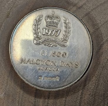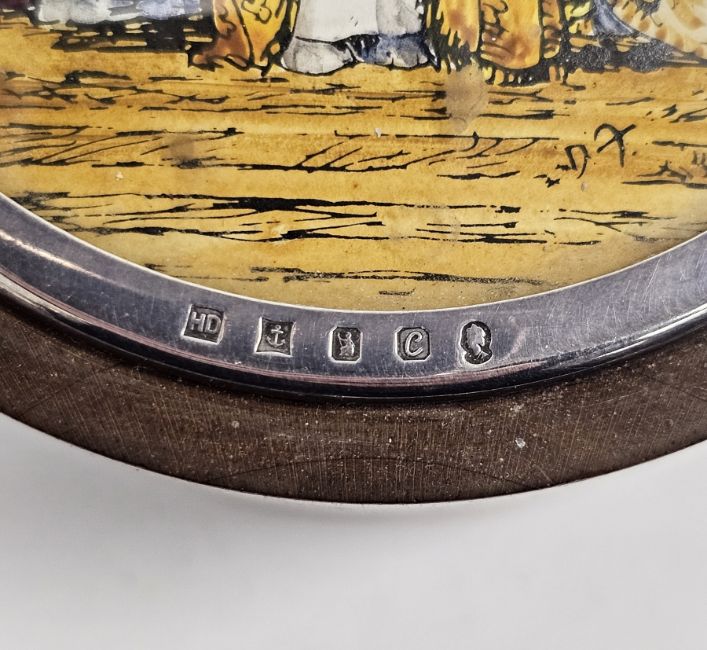 Halcyon Days silver mounted with wooden circular box commemorating the Queen's silver jubilee, limited edition no. 61/500, 9.5cm diameter together with silver mounted and horn shoe horn, Sheffield 2000, 35cm long and a silver mounted and horn backed dressing brush, London 1999 (3)