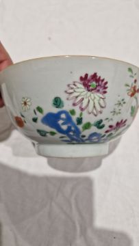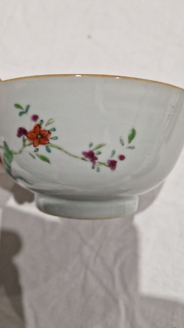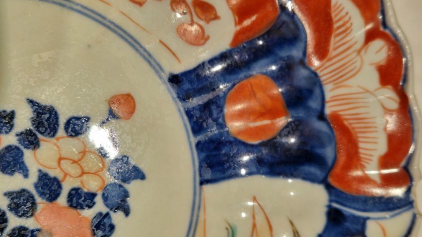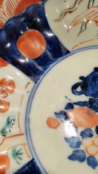 19th century Chinese porcelain famille rose plate and bowl, the plate with enamel decoration with peacocks and flowers, 23cm diameter and the bowl with enamel decoration of flowers, 15cm diameter together with two Japanese Imari pattern fluted plates (4) Condition Report Light surface marks and accretions to all.Famille rose plate - Chip to underside of rimImari plates - both with chips and nibbles to edges, wear to decoration.Bowl with light wear to decoration.General wear and tear.