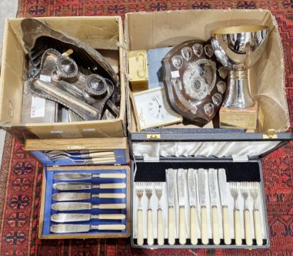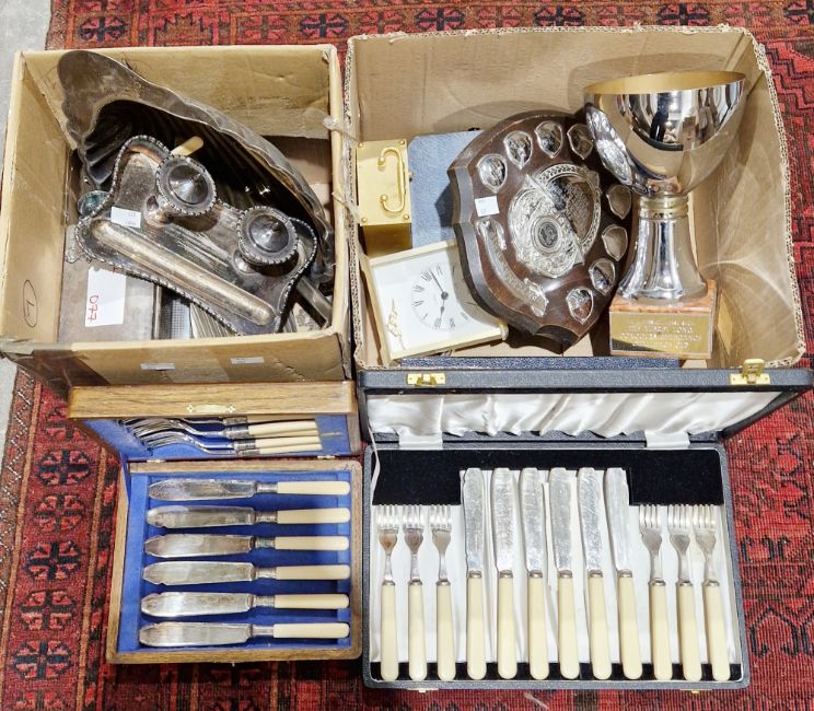 Mixed lot of silver plate and collectable items including a standish, large clam shell shaped bowl, cigarette box, napkin rings, trophies, cased flatware, carriage clocks and other items (2 boxes)