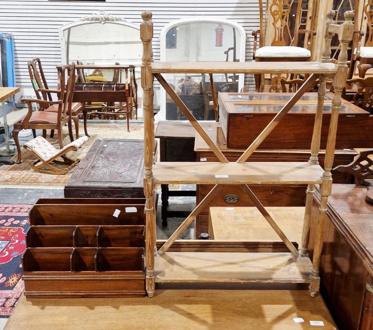 Early 20th century pine hanging wall shelf, the open sides with turned spindle supports, united by a cross-stretcher to back, 52cm wide x 16cm deep x 82cm high, together with a modern mahogany desk tidy/letter rack by Libra (2)