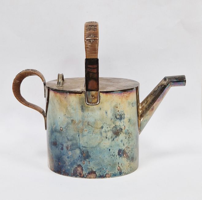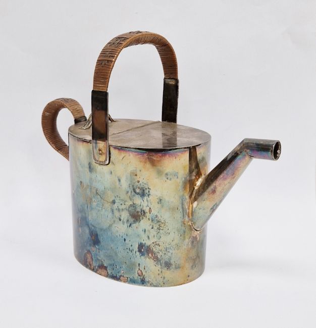 Hukin & Heath silver plated watering can designed by Christopher Dresser, the two handles with wicker covers, hinged lid, stamped marks H&H 9659. 19cm high