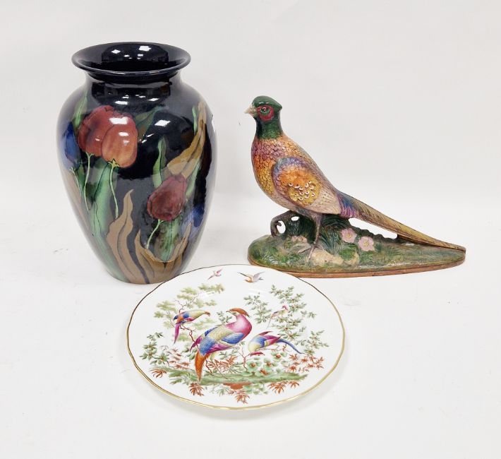 Royal Stanley ware C & C Co Jacobean vase decorated with tulips, 32cm high, a handpainted and printed decorative plate depicting three vibrantly birds perched on branches, marked to reverse 37A Black 301049 and a Shannock pottery figure of a pheasant (3)