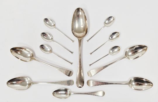 Collection of silver spoons including table spoon, London 1759, matched set of four George III dessert spoons, George III teaspoon and a set of five Mappin & Webb silver teaspoons, Sheffield 1924, total weight 7.36ozt