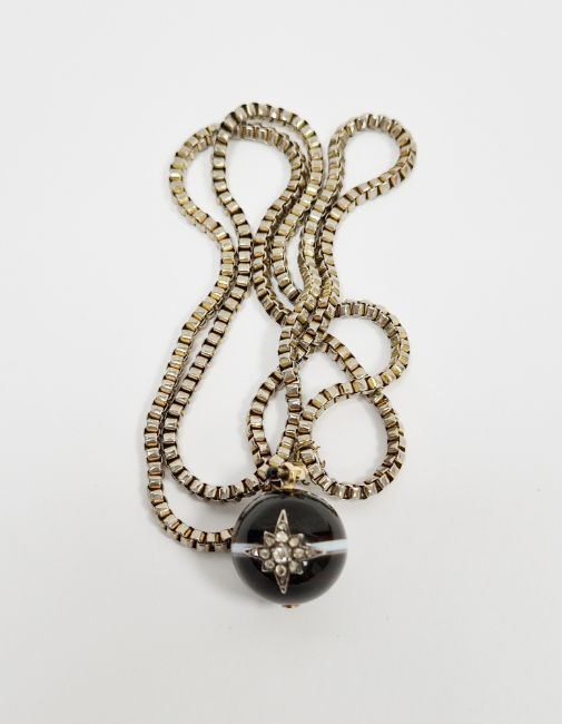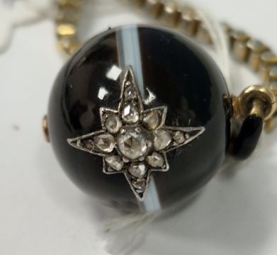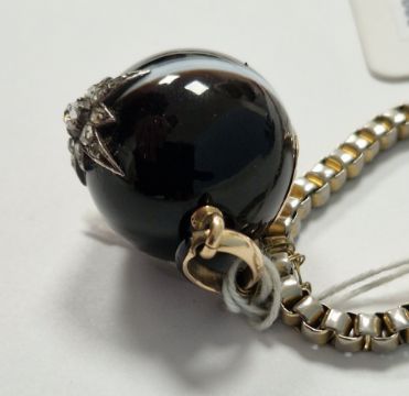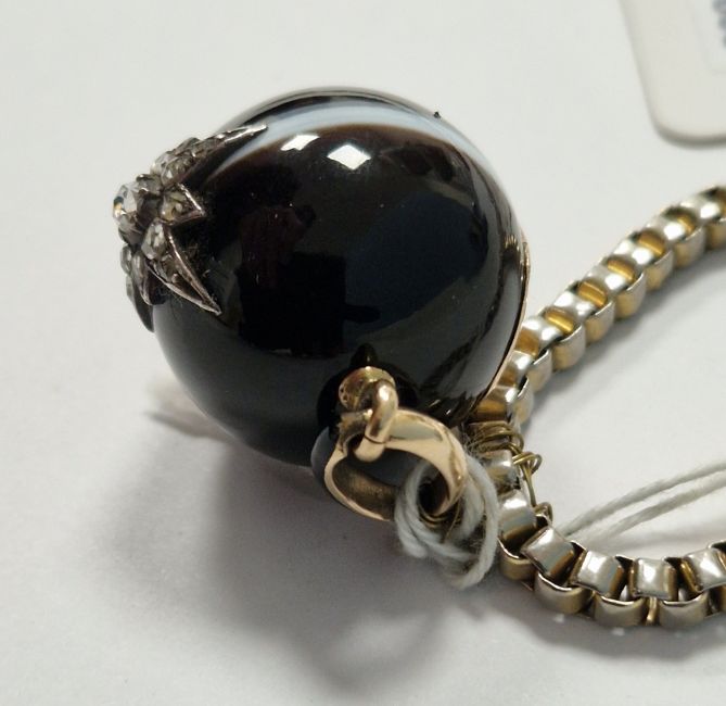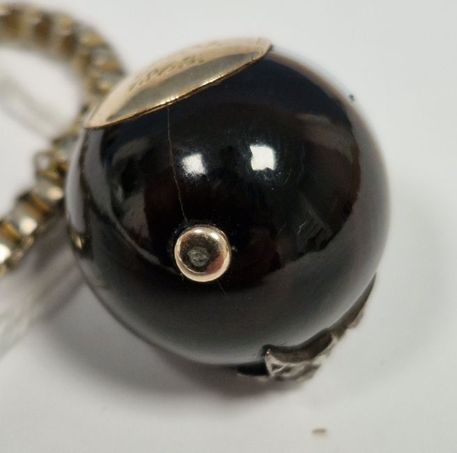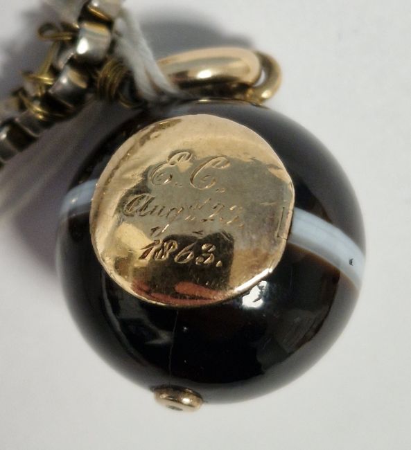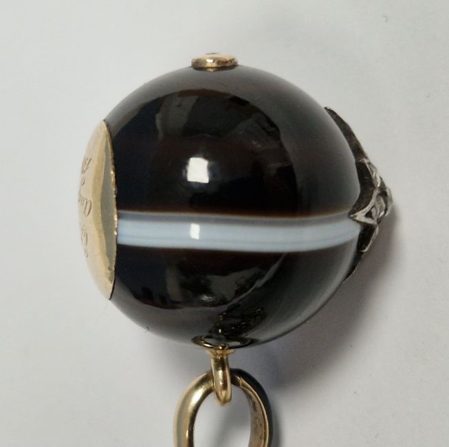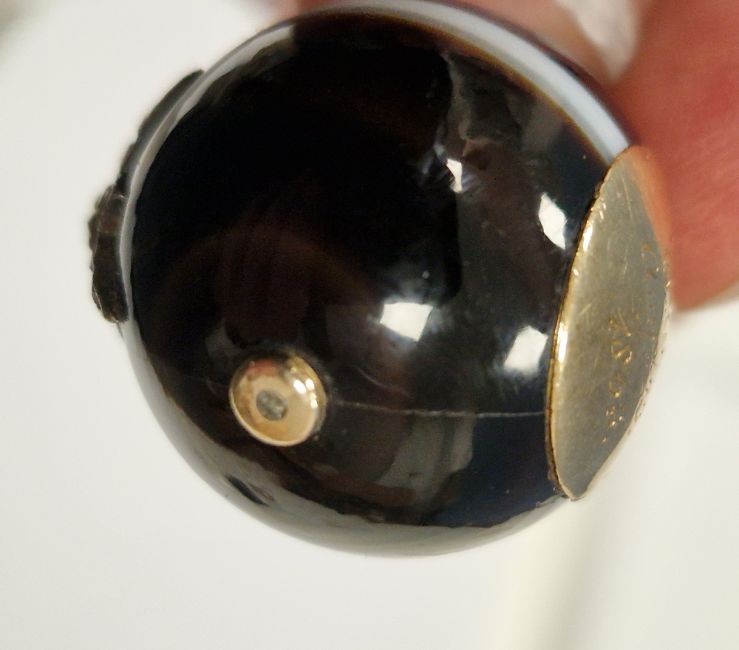 Agate ball with some light surface scratches. Small crack to one side. General wear and tear.