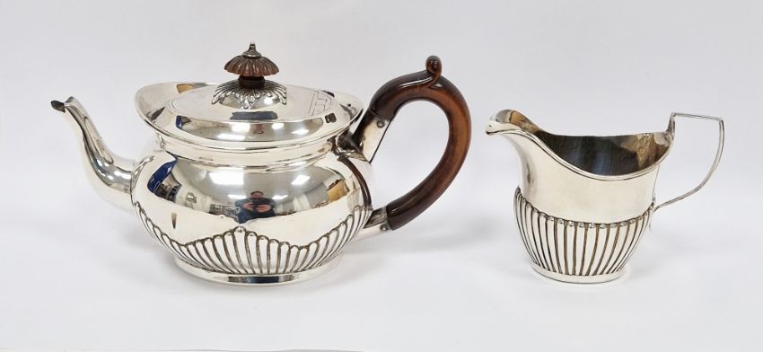Victorian silver bachelor's teapot, oval with stained wood gadrooned finial and scroll handle, the body semi-gadrooned, 21cm wide, London 1892 and a silver cream jug, oval with angular handle and semi-gadrooned, 8cm high, Birmingham 1913/38(?), 13.5ozt total approx. (2)