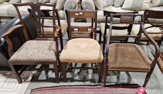 Set of three Regency mahogany dining chairs including one carver, three further 19th century mahogany dining chairs and another (7)