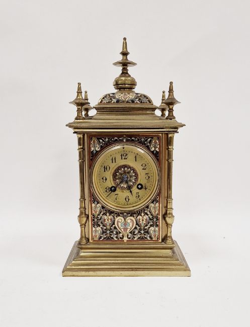19th century French brass and cloisonne enamel 8 -day mantel clock, the pillared step case surmounted by a caddy top with finial, the brass dial with central cloisonne panel and Arabic numerals, Japy Freres movement, 34cm high