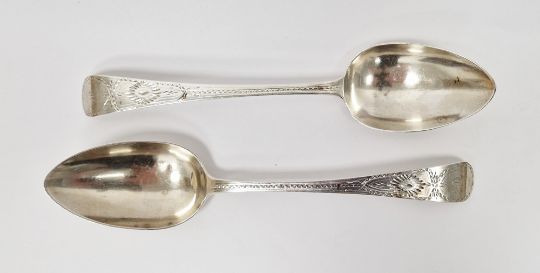 Pair of George III provincial  silver table spoons, Exeter 1790, Joseph Hicks, old English pattern with bright cut engraving, hand etched to back with initials and the date 1791, 21.5cm long, 4.01ozt