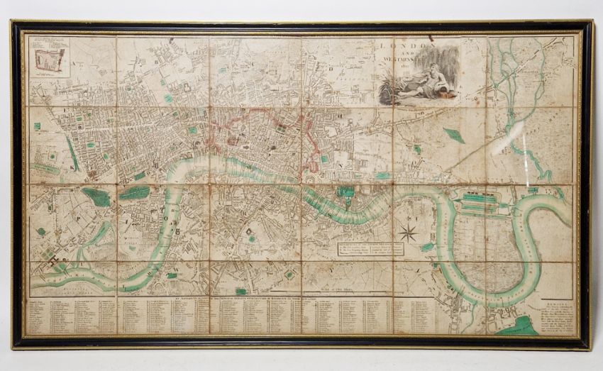 John Fairburn (1789-1840) Fold out hand-coloured detailed plan of "London and Westminster", seventh edition dated 1802, with inset map of the "Enlarged Plan of the Rules of Fleet Prison" illustrating Fleet Prison, Newgate, Keepers House, Felons Door, Sessions House, City Barracks, & St. Martins Church. Alphabetical list of 300 principal streets, with letters of reference to their situation in bottom margin. The title in the upper right corner overlays a large vignette scene depicting the reclining figure of Father Thames, framed and glazed, image size 44cm x 80cm Condition Report Map does not appear to mounted on card. It does appear to have a linen/canvas backing to it.