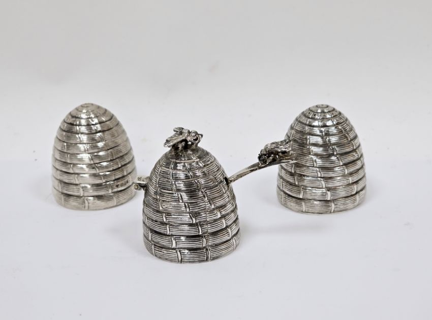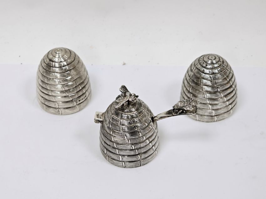 Novelty silver condiment set in the form of beehives, London 1990, Garrard & Co Ltd, comprising salt, pepper and mustard pot with spoon, the mustard pot and spoon with bee finials and gilt lined interior, 5cm high, approximate total weight 8.18ozt