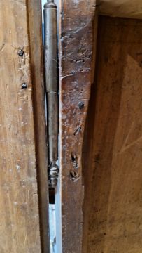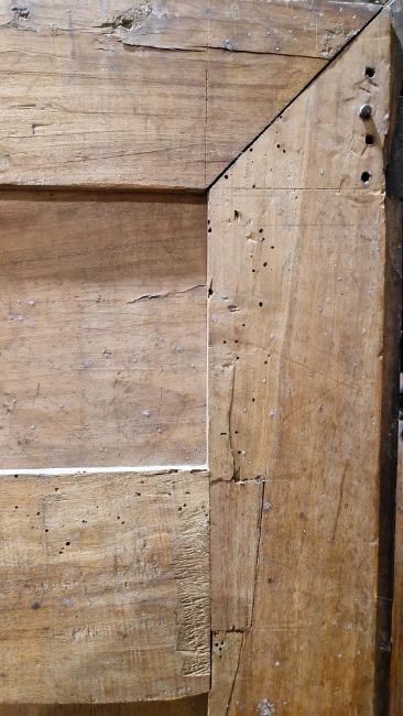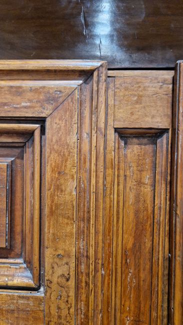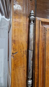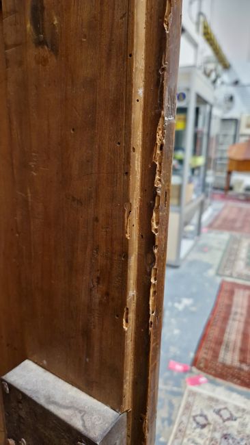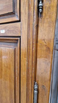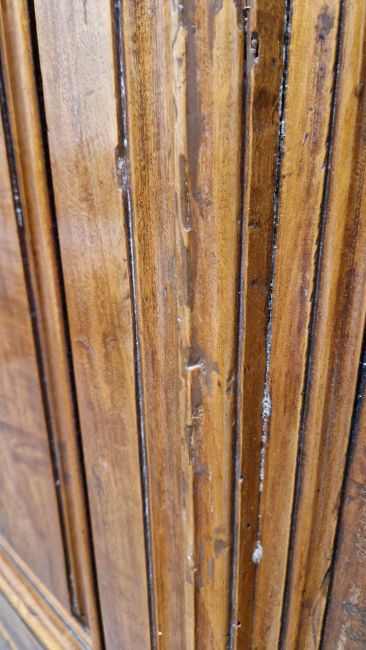 Surface scratches, scuffs and knocks, fading and discolouration. Old worm in places resulting in losses to the wood. Lock mechanism on left door missing. Repairs using some kind of brown putty in places, mainly both doors. Base has seperated front left corner. Old repairs in places. Cornice with damage, splits/chips to both front corners. General wear and tear.