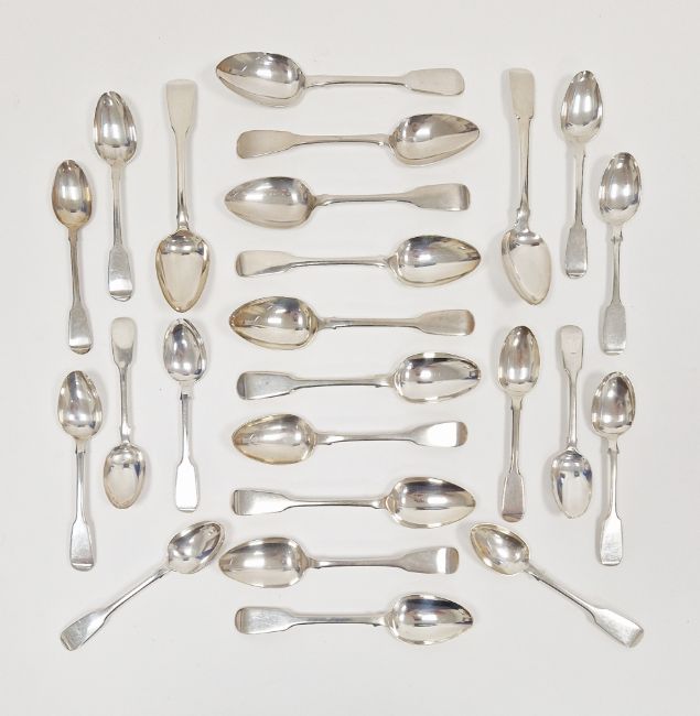 George III and George IV matched set of twelve silver dessert spoons, various London dates and makers, fiddle pattern, each 17.5cm long together with Victorian matched set of twelve silver teaspoons, various dates and makers, fiddle pattern, total weight 22.15ozt