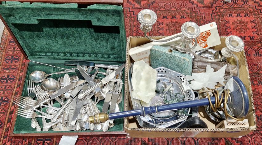 Collection of metalware and other items including wooden cased part canteen of Dubarry pattern silver plated flatware, other silver plated and stainless steel items, piece of fossilised tree, white metal bear attached to an amethyst crystal, carved stone model of two doves and other items