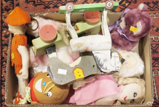 Mixed lot of children's toys, ceramics and collectable items including various early to mid 20th century ceramic nursery ware including Royal Doulton ' Hey Diddle Diddle ' cup, saucer and bowl,  Ford's china ' Simple Simon ' cup and saucer, Paragon ' Noah's ark ' mug, together with piano babies, three Royal Worcester birds, set of Wee-kin baby toy tin plate stacking cups, Chad Valley tin plate nursery clock, Chad Valley tin plate spinning top, various advertising tins, Merrythought felt ' Cora Goffin as Aladdin ' doll, three Steiff soft toys including teddy bear, frog and chick, Merrythought baby bunting doll, etc
