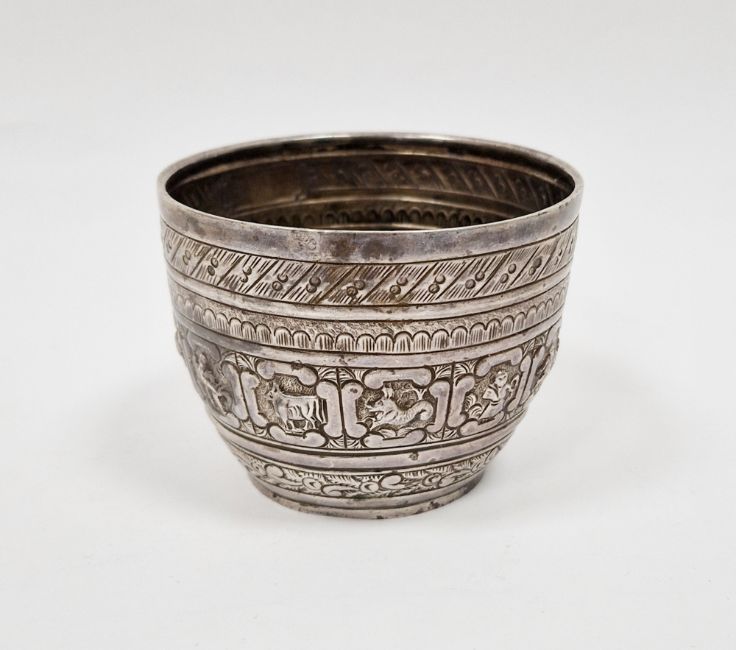 Victorian silver bowl, London 1883, Henry John Lias & James Wakeley, repousse decoration including a band of twelve vignettes depicting the signs of the zodiac, empty cartouche, 6cm high, 2.97ozt