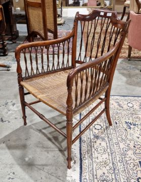 19th century fruitwood side elbow chair with twisted cane spindle back and wicker seat, 48cm wide x 56cm deep x 77cm high