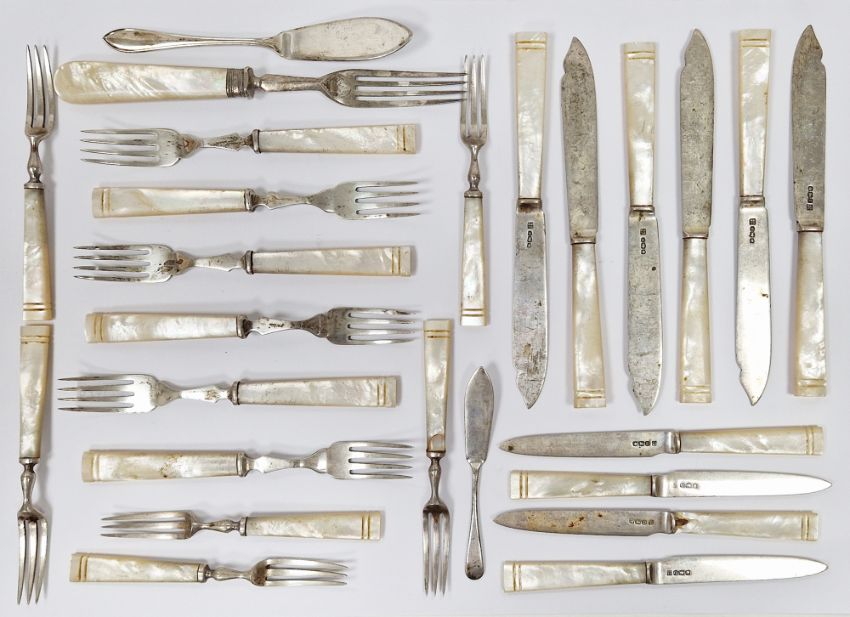Collection of matching knives and forks, each with silver blades / tines (Sheffield 1946, 1947 & 1948 John Sanderson & Son Ltd) and mother of pearl handles comprising 12 forks, 4 knives and 6 fish knives together with another fork with silver tines and mother of pearl handle and two silver butter knives