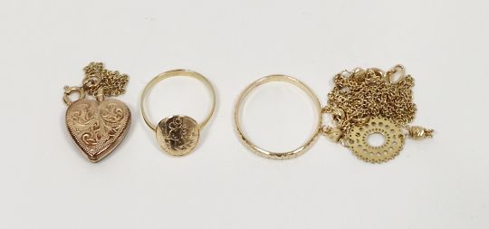 Collection of 9ct and 9k gold items including 9ct gold signet ring, 9k gold wedding band, 9ct yellow gold heart shaped locket pendant, approximately 1.2cm long together with 9ct gold link bracelet, and a 9ct gold necklace link, approximately total weight 5.7 grams