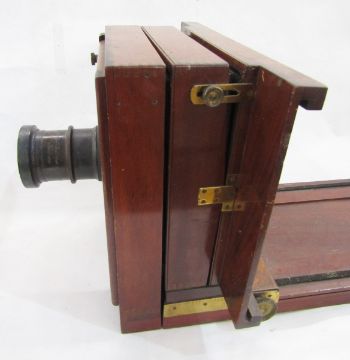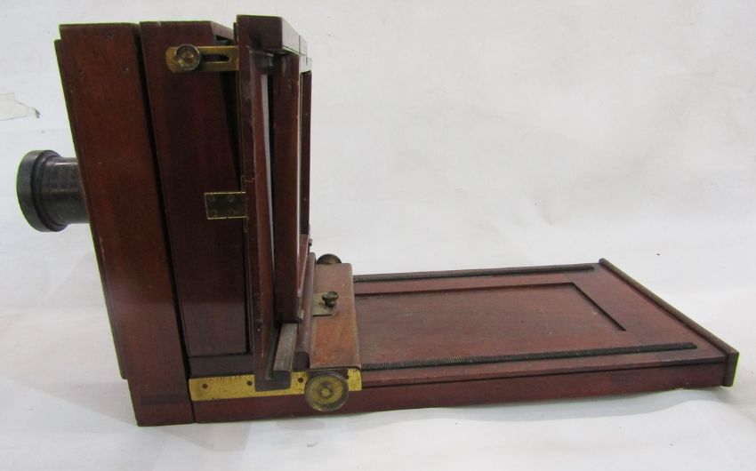 City Sale and Exchange 'Salex' mahogany and brass-mounted tailboard camera, early 20th century, with an Emile Busch 14" lens 'A Portrait Aplanat No.4' and two full plate holders (2)