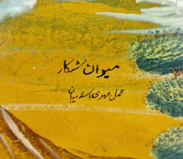 Indian school Oil on panel "Hunting Ground", wild animal hunt with figures on horseback, titled top right, 34cm x 32cm
