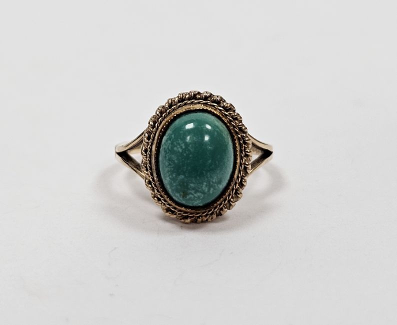 9ct gold and turquoise cabochon ring set single oval stone with rope twist surround. Ring size I, approx 3g