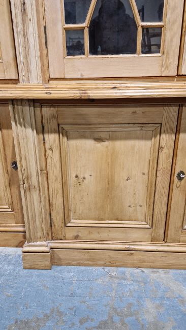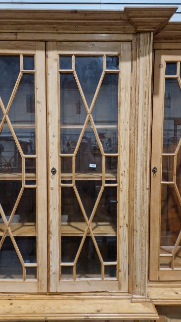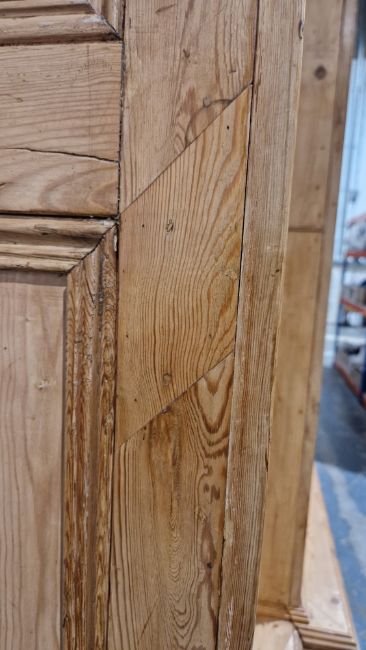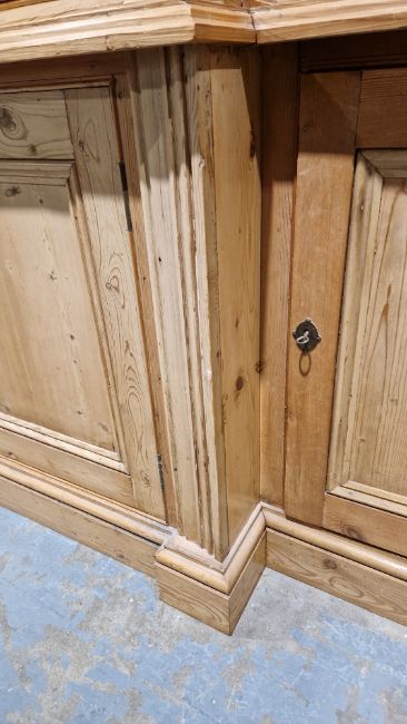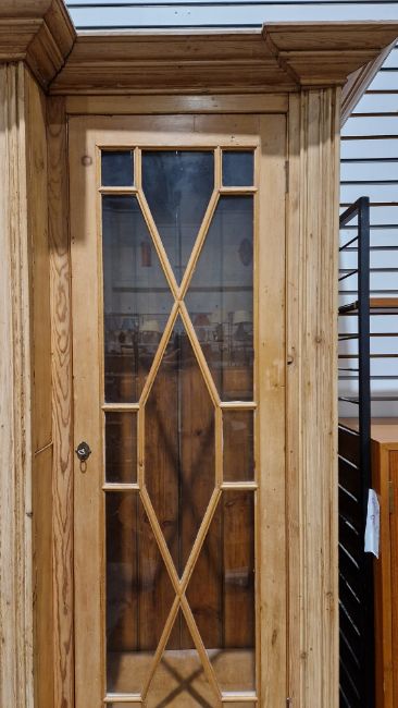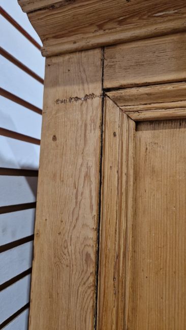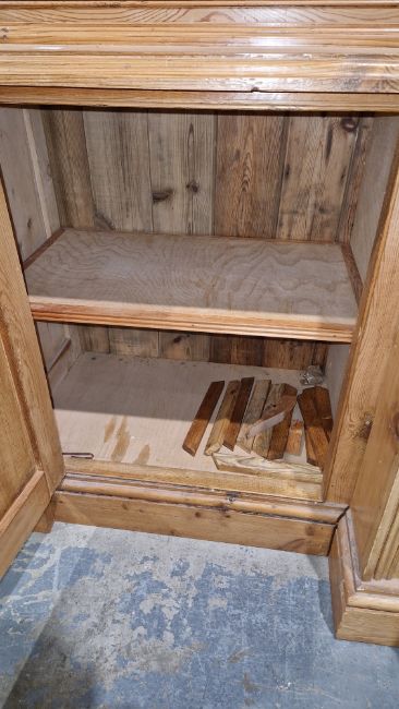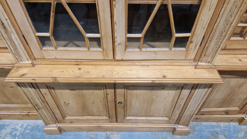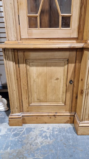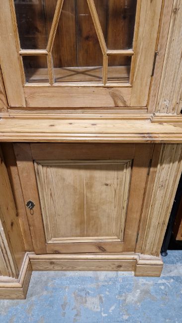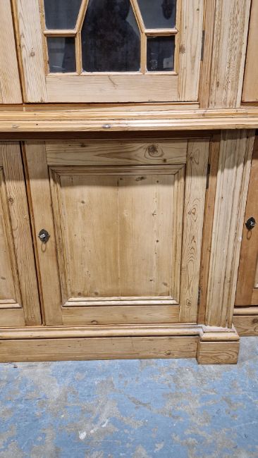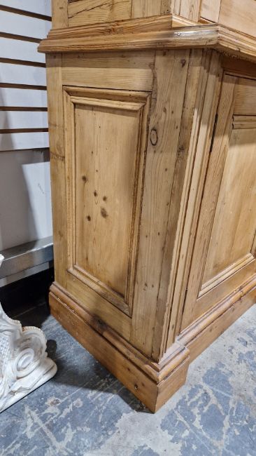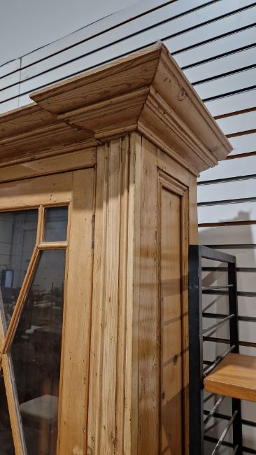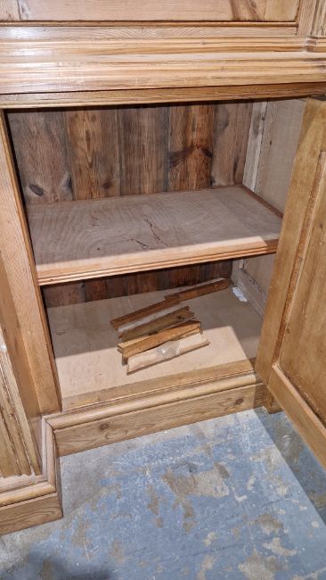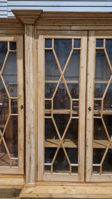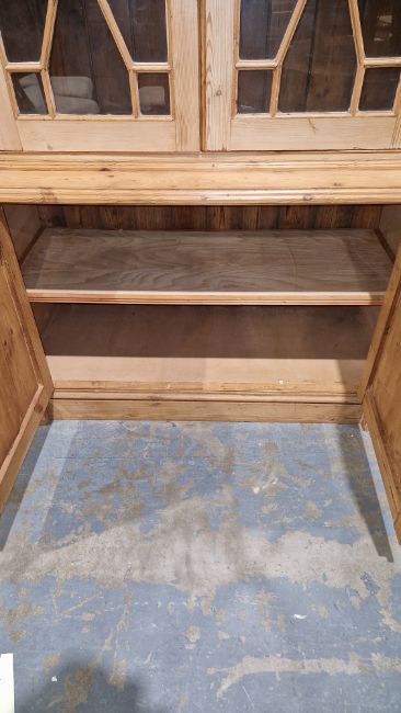 Good overall condition. Surface scratches, scuffs and knocks. Has been stripped back, some stripping agent residue and small areas of paint remaining. Some small sections appear to have been replaced/repaired. Comes apart in three top sections and one base section. General wear and tear. Shelves are moveable, one shelf in each cupboard.