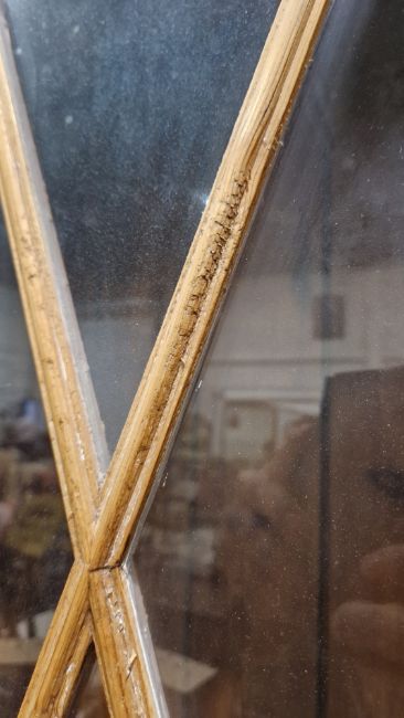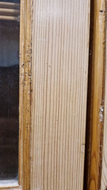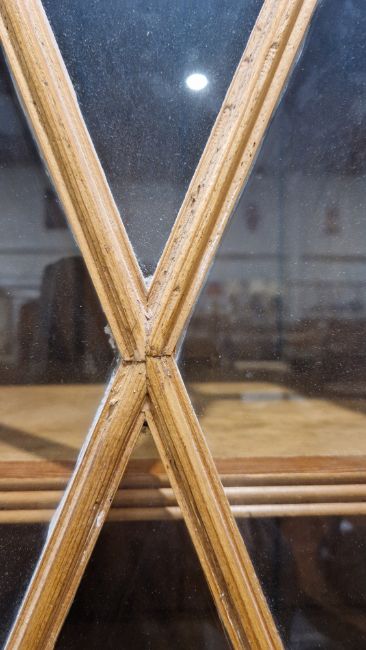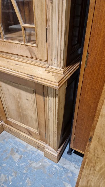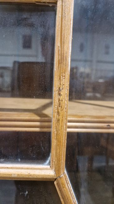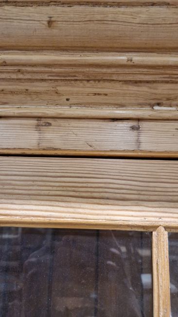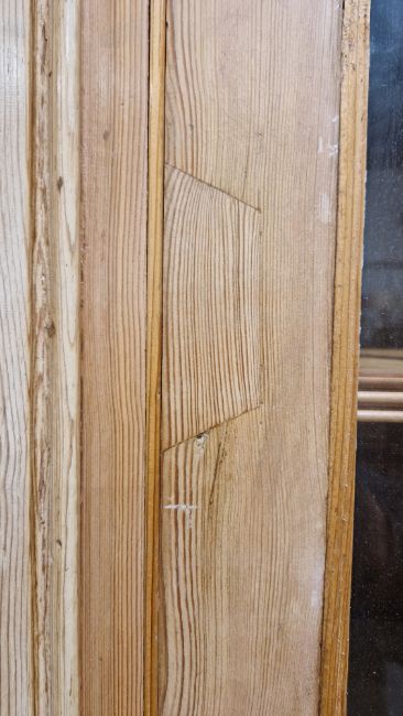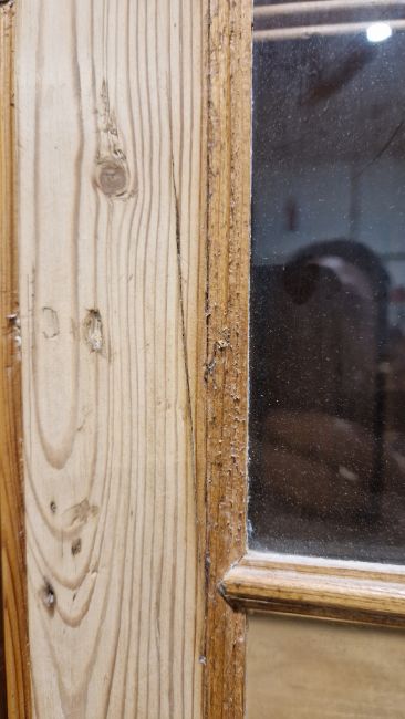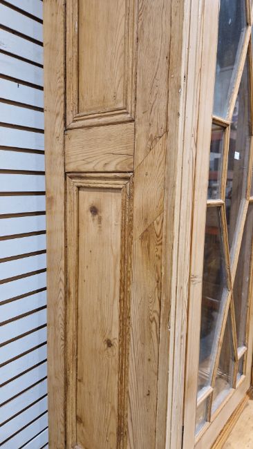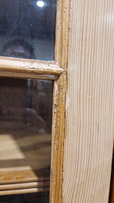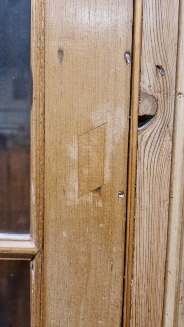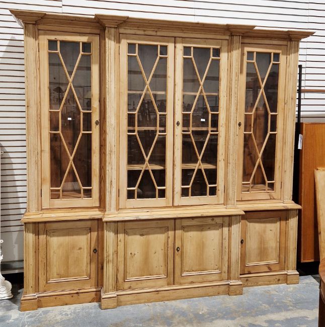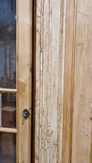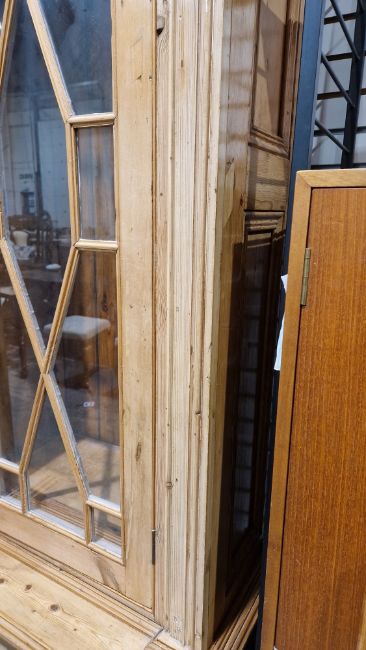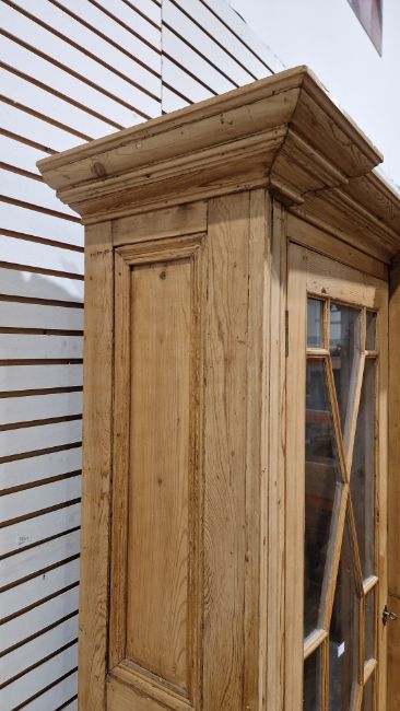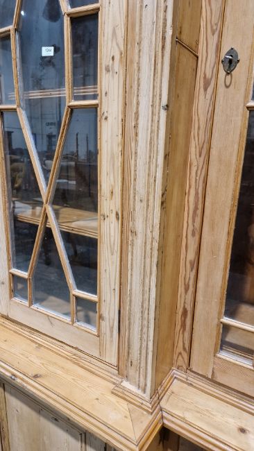 Good overall condition. Surface scratches, scuffs and knocks. Has been stripped back, some stripping agent residue and small areas of paint remaining. Some small sections appear to have been replaced/repaired. Comes apart in three top sections and one base section. General wear and tear. Shelves are moveable, one shelf in each cupboard.