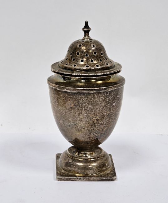 Victorian silver sugar sifter, Birmingham 1887, Deakin & Francis, the pierced lid with finial and beaded edge, plain urn shaped body and raised on a square flat foot, 13cm high, approximate weight 3.92ozt