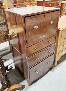 18th century oak chest of four drawers, in two sections, the upper section with brass swan neck carrying handles and the top having a hinged lid opening to the upper drawer with four circular apertures, the top drawer being deep, over a shallower second drawer, the lower section with two further graduating drawers, each drawer with brass oval loop handles, raised on swept bracket feet and with a shaped apron, 62cm wide x 54cm deep x 116cm high