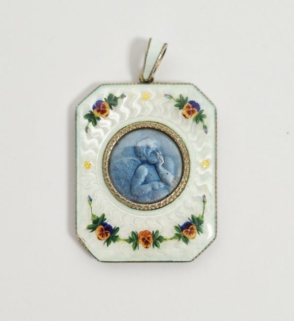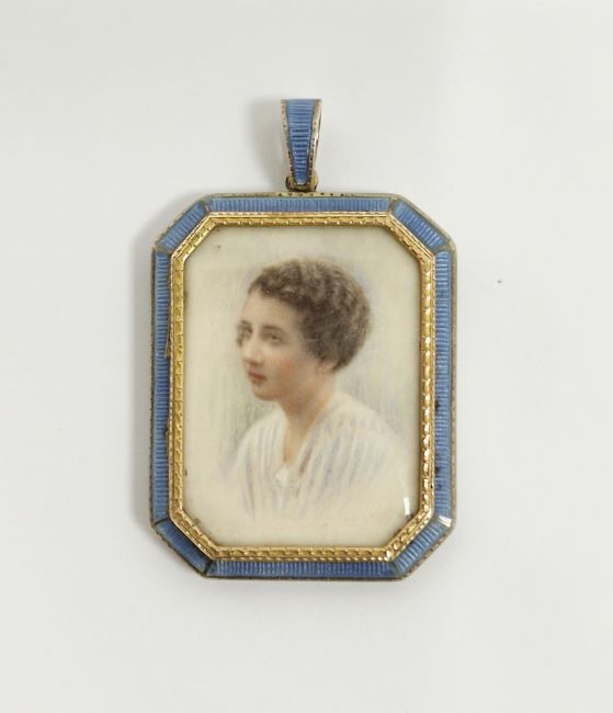 Early 20th century yellow-metal and guilloche enamelled miniature portrait pendant, the rectangular pendant with canted corners having blue guilloche enamelling surrounding the portrait painted on ivory of the head and shoulders of a young woman, the reverse with white guilloche enamelling decorated with flowers having a circular aperture containing a cherub, 4.8cm high (ivory submission reference number LLQ3BCTA)