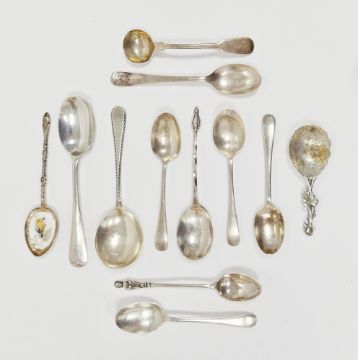 George IV silver salt spoon, London 1822, Thomas Wilkes Barker together with teaspoon marked 90 with enamel set bowl decorated with flowers together with a further seven silver spoons and three further spoons, total silver weight approximately 3.60ozt