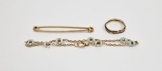 9ct gold safety pin style brooch, 5.5cm long, 3.1 grams together with an antique yellow metal band and a yellow metal oval link bracelet with seven opal and faceted glass spacers, 21.5cm long
