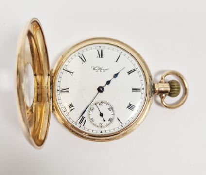 9ct gold cased half-hunter pocket watch by Waltham, the enamel dial with Roman numerals denoting hours, seconds subsidiary dial at the half-hour mark, movement marked 'AWW Co Waltham USA Traveller', the 9ct gold case stamped 'Denison Watch Case Co Ltd', gross weight 97g approx.