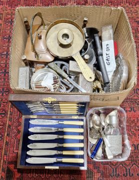 Collection of metalware including Art Nouveau WMF copper spirit kettle (lacking stand), pair of mid century Prices stainless steel candlesticks together with other metal ware including trivets, silver plate, pewter, flatware, opera glasses, flat irons and more