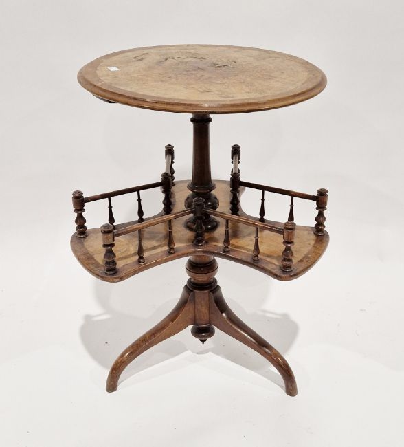 19th century walnut two-tier circular whatnot, the second tier with revolving triform shelf with spindled gallery rail, raised on a turned column support and three outswept legs, 54cm diameter x 69cm high