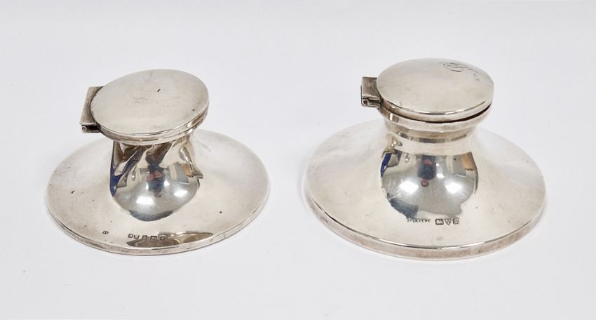Two silver capstan inkwells, one Chester 1924, S Blanckensee & Son Ltd, 9.5cm diameter and the other Birmingham 1909, Henry Matthews, 9cm diameter, both of typical plain form