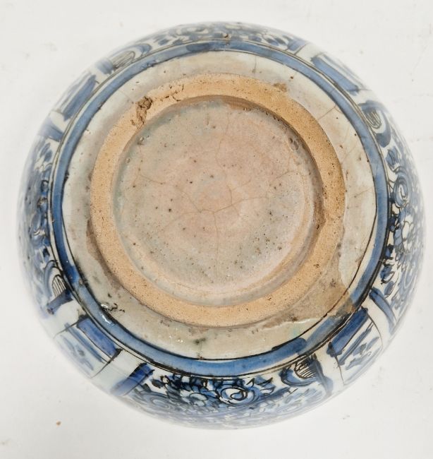 Persian (Iran) blue and white bowl, 18th century, painted with panels of flowers and lappet-shaped ornament, 28.3cm diam.