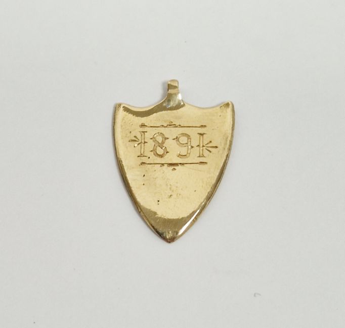 Victorian gold shield-shaped pendant, rubbed hallmarks, presented as an award for the Transvaal Association Challenge Cup in 1891, approximately 2.5cm long, 3.6 grams