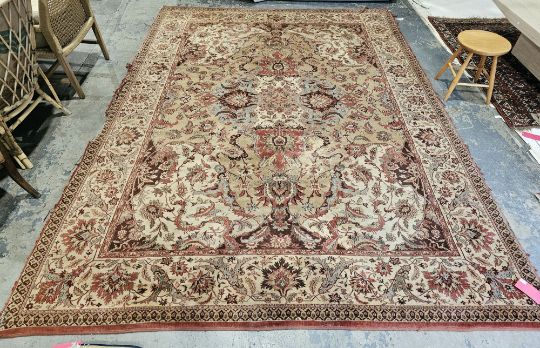 Large cream ground carpet with central floral medallion on floral field, multiple floral and herati borders 325cm x 246cm