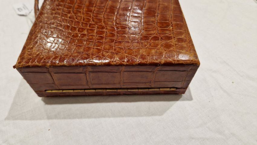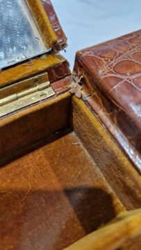 Surface scratches, scuffs, creases and accretions to the skin. Loss to area of croc skin on handle. Small tears and splits. Lock section on lid missing. Badge or something missing from top of lid above metal BN badge. General wear and tear.