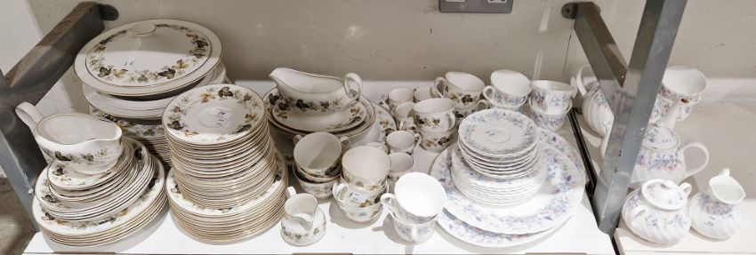 Royal Doulton Larchmont part dinner service, printed grey marks, printed with green leaves and grey foliage, within gilt rims, including: two vegetable tureens and covers, a sauceboat, soup, dinner, luncheon and side plates, tea and coffee cups and saucers and others items, together with a Wedgwood bone china Angela pattern part tea service