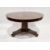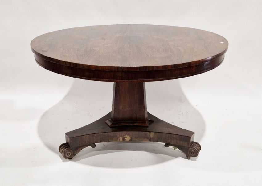 William IV rosewood centre table, the circular tilt top raised on a triangular chamfered inverted tapering support and platform base terminating in scrolling feet and castors, 123cm diameter x 72.5cm high, together with an ash ladderback chair with solid seat (2)