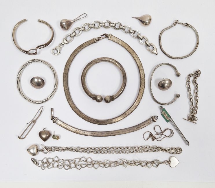 Collection of silver hallmarked and other silver items of jewellery including silver hallmarked bangle, silver hallmarked link necklace with heart shaped pendant, silver hallmarked heart shaped pendant on heart shaped link necklace, silver bangle, pair of silver earrings, silver link bracelet and other silver items (total silver weight approximately 117 grams) together with various white metal jewellery including necklaces, bracelets and bangles